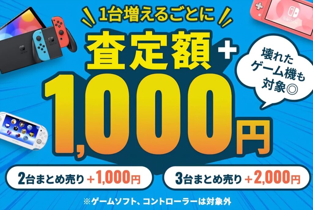 12月限定!まとめ売りで1台につき+1,000円買取価格UPキャンペーンを実施しているため、要らないゲームや壊れたゲームがたくさんあるほど他の買取店よりも高価買取をしてくれる可能性が高いんです!