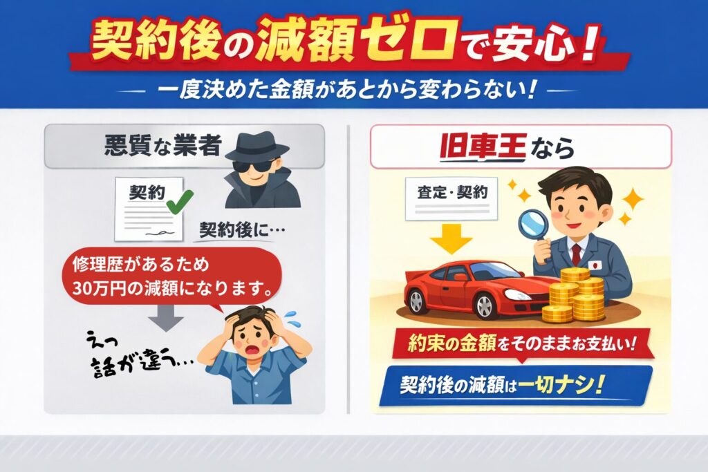 契約後の減額をしない旧車王なら、あとから金額が下がることはありません。旧車王では、