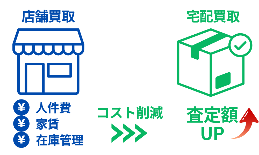なぜなら、店舗を構えるには「家賃・人件費・在庫管理」といったコストがかかります。一方で宅配買取専門の業者は、これらのコストを削減できる分を査定額に上乗せして還元しているからです。