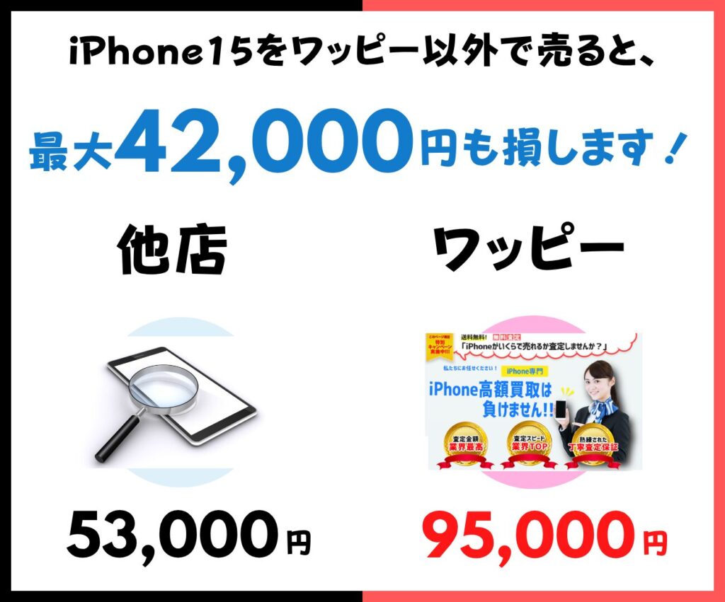 例としてiPhone15の買取価格を比較した結果、ワッピー以外で買取をすると同じ状態でも最大40,000円以上も損をすることも…!