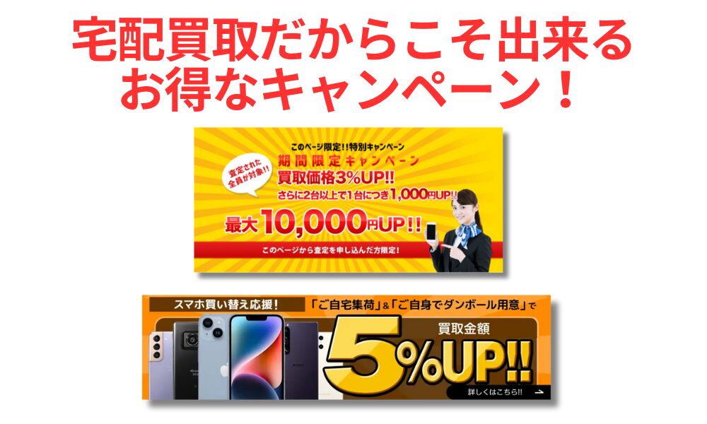また、コストがかからないからこそ買取価格UPのキャンペーンを実施していたり、まとめ売りで買取価格が上がることが多いことから、「とにかく高く売りたい!」という方には、断然宅配買取サービスがおすすめです。