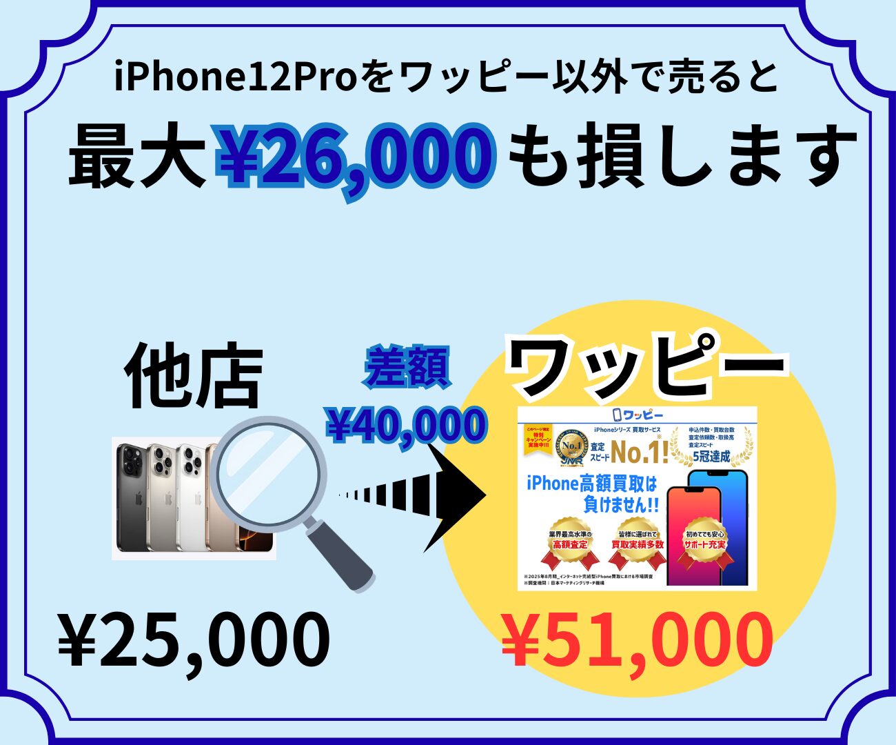 iPhone12proの買取価格を比較した結果、ワッピー以外で買取をすると同じ状態でも最大22,500円も損をすることも…!