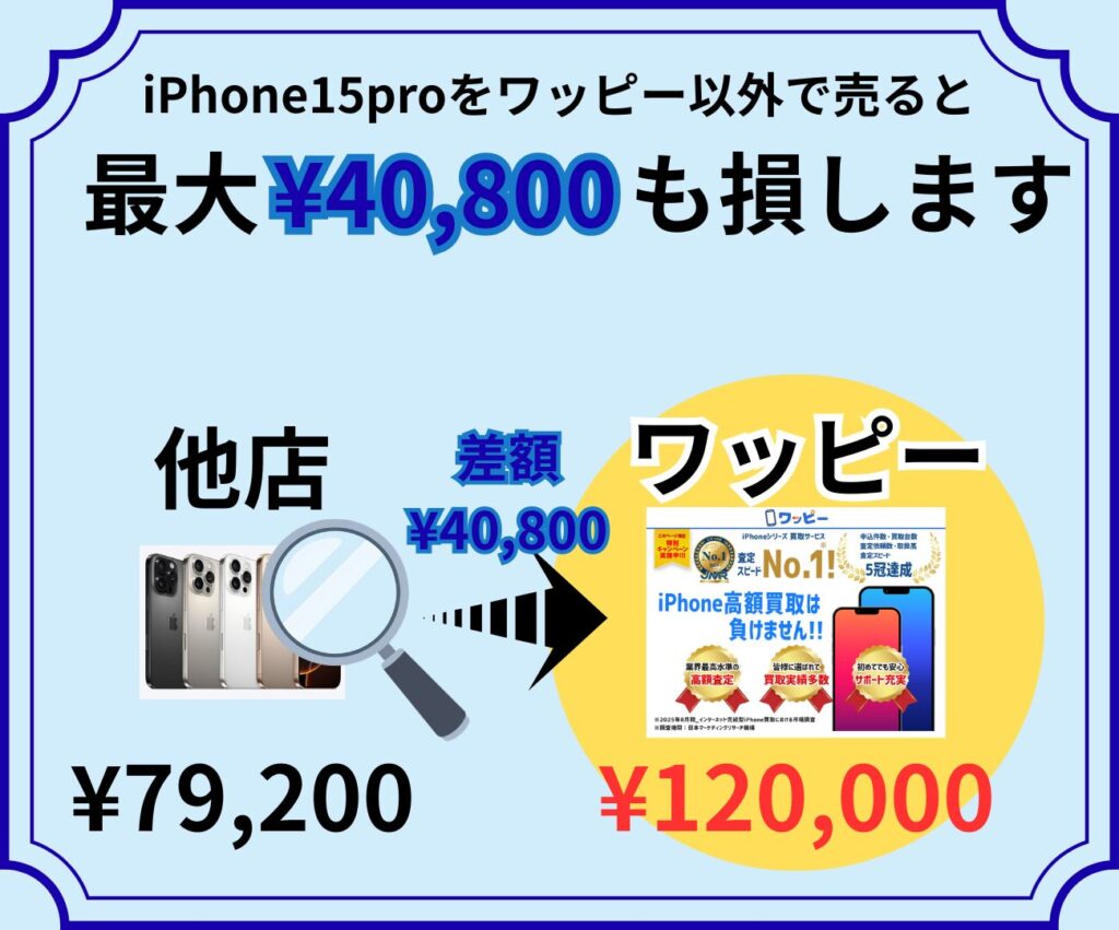 iPhone13proの買取価格を比較した結果、ワッピー以外で買取をすると同じ状態でも最大48,000円も損をすることも…!