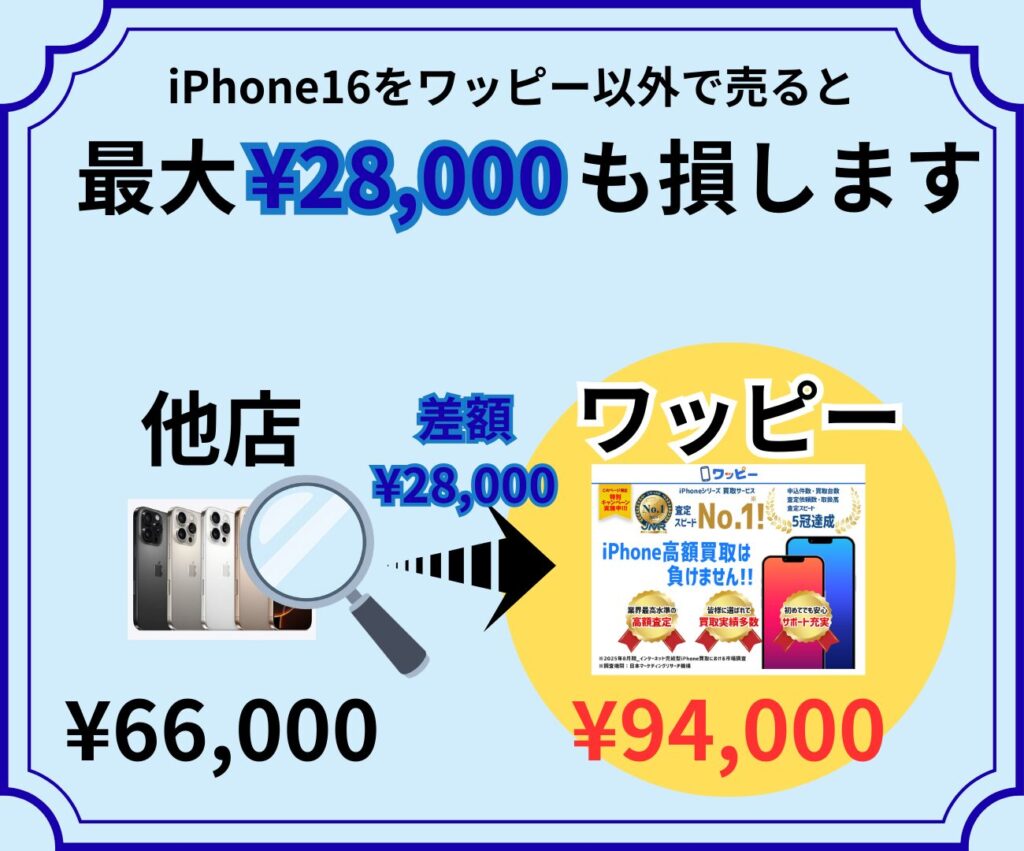 iPhone13proの買取価格を比較した結果、ワッピー以外で買取をすると同じ状態でも最大48,000円も損をすることも…!