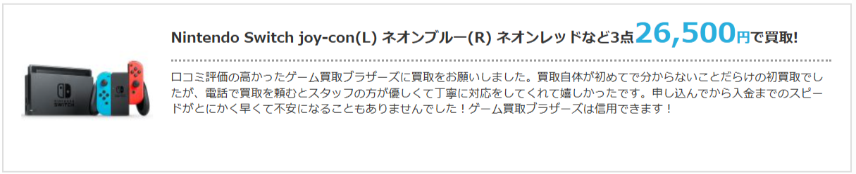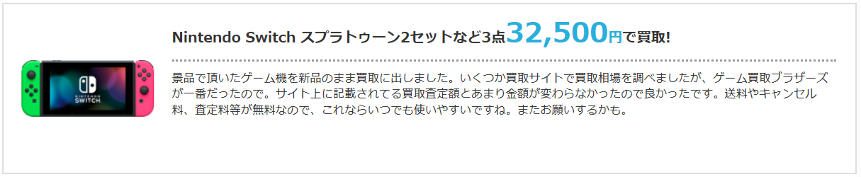 | ゲーム買取ブラザーズ(無店舗) | ◎ かなり高額 | Switch・PS4などを買取強化中 |