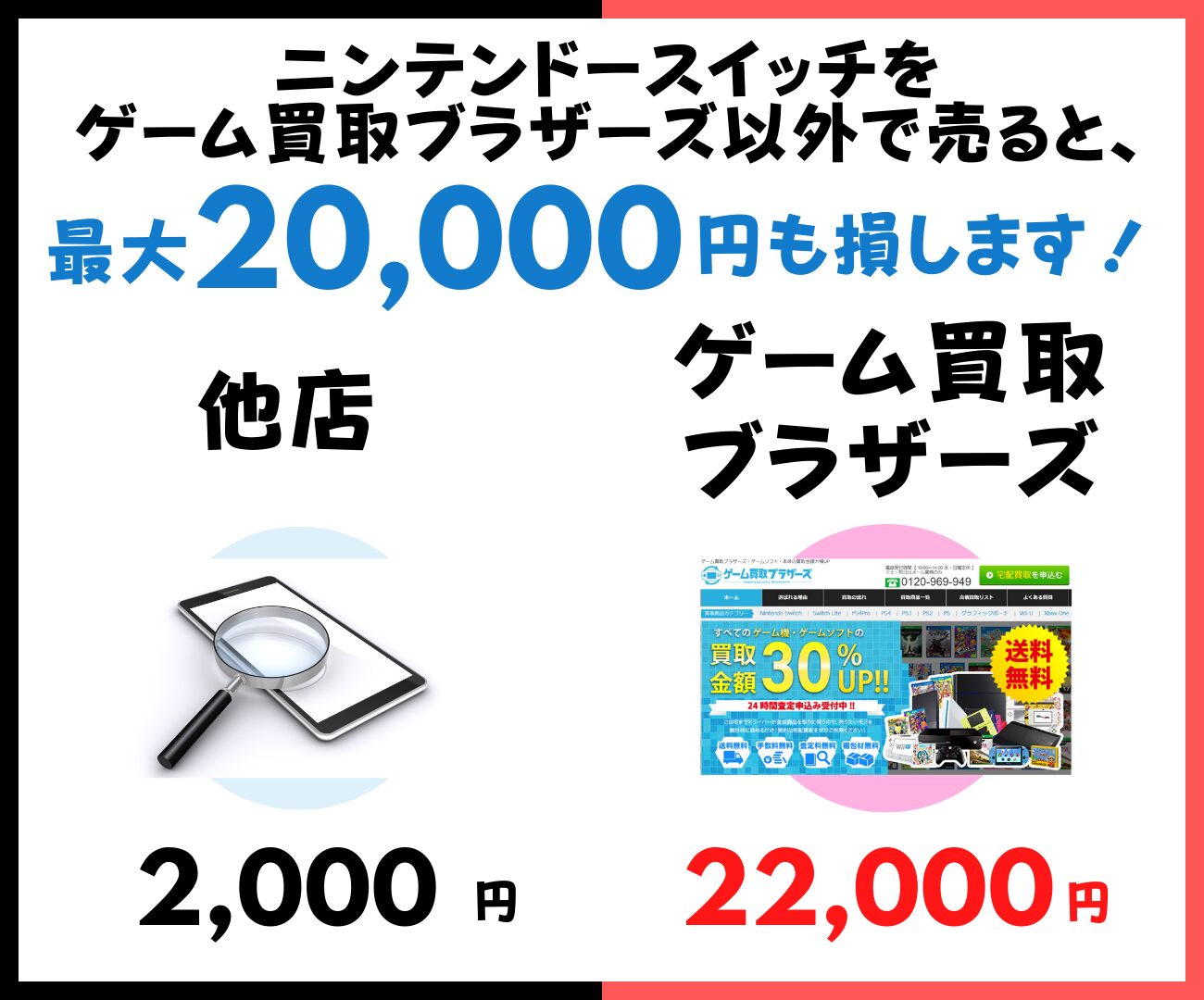 Nintendo Switchの買取価格を比較した結果、ゲーム買取ブラザーズ以外で買取をすると最大20,000円も損をする可能性があります!